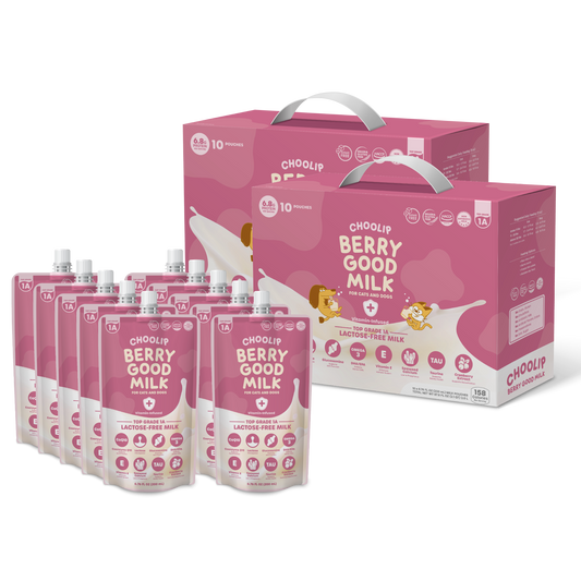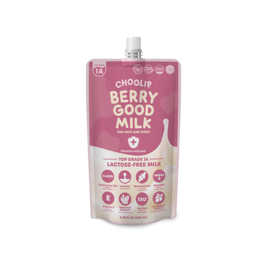 Choolip Berry Good Pet Milk is a creamy, easy to serve, nutritious drink for healthy cats and dogs. Made from REAL lactose-free, antibiotic-free, HACCP-certified milk and infused with joint and urinary care supplements, it supports healthy pets in their quest for morning snuggles, evening zoomies and shredding furniture.