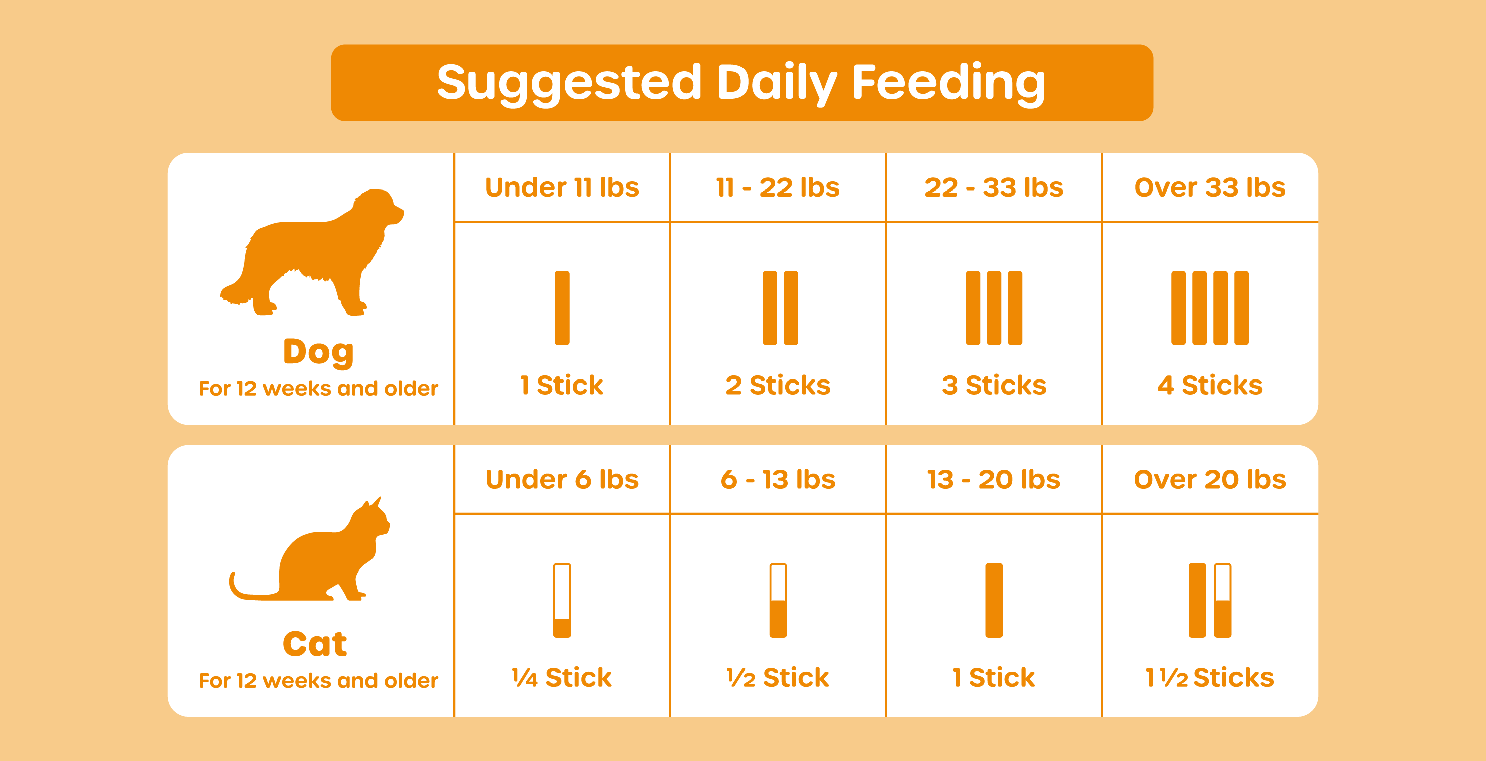 For a dog, up to 9lbs (1 stick), 9-18lbs (2 sticks), 18-26lbs (3 sticks), 26lbs+ (4 sticks). For a cat, up to 7lbs (1 stick), 7-13lbs (2 sticks), 13-22lbs (3 sticks), 22lbs+ (4 sticks). Of course, this is just a guide. You might have a 26lb dog who gets one stick a day for being a good boy. If you plan on treating more than once a day, consider our packs of 49 sticks for best value.